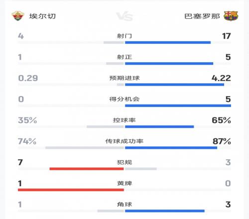 体育播报2月1日宣 本轮西甲,巴萨半场2-1领先埃尔切。双方半场重点数据对比如下↓(主队埃尔切在前)