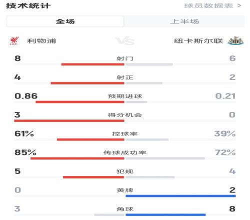 利物浦半场21纽卡数据:射门86,射正42,控球率61%39%